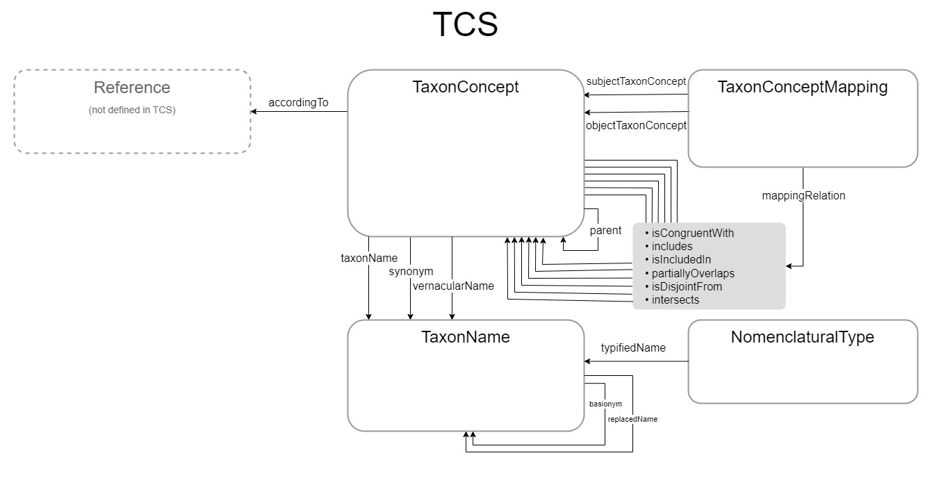 The Taxon Concept Schema (TCS) is the TDWG standard for exchanging taxonomic data. It is one of the ‘2005’ group of standards, together with Access to Biological Collections Data (ABCD) and Structured Descriptive Data (SDD), that consists of an XML Schema. Unlike ABCD, TCS did not have a dedicated group of users or maintainers and has not been maintained since shortly after it was ratified. Any problems that people might have with TCS were never fixed, because there was no mechanism for making formal changes to the XML Schema.